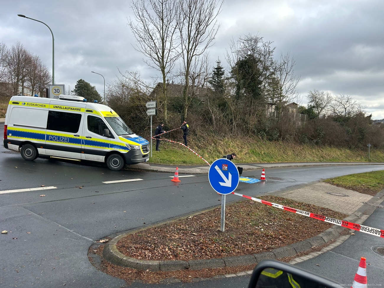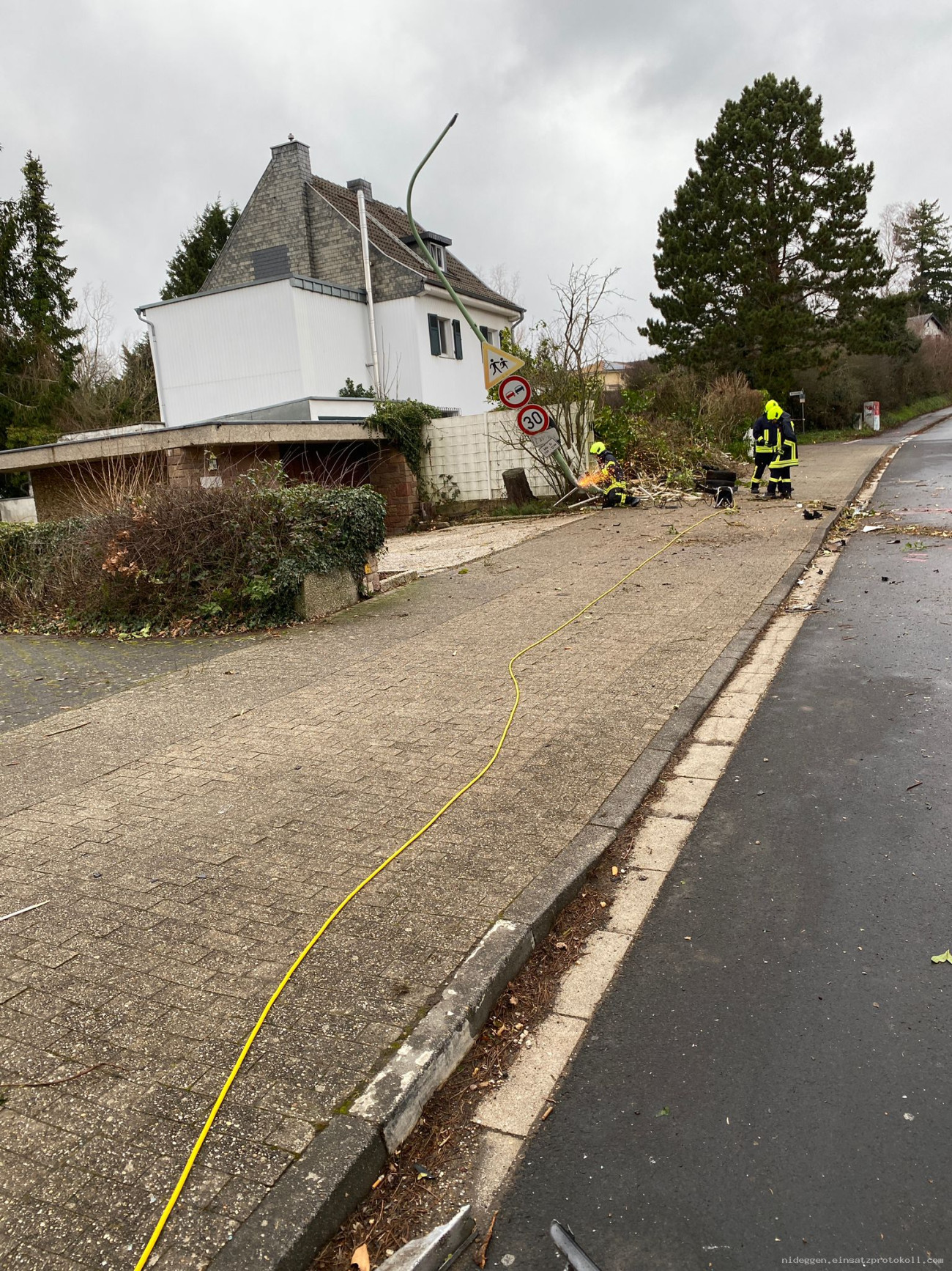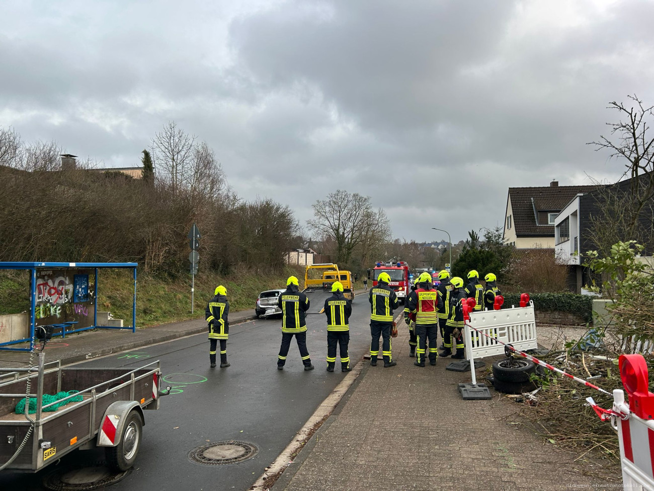 Nach Abschluss der Unfallaufnahme durch die Polizei erfolgte eine erneute Alarmierung der Feuerwehr zur Einsatzstelle in der Rather Straße. Dort reinigten die Einsatzkräfte die Fahrbahn und entfernten die abgeknickte Straßenlaterne.